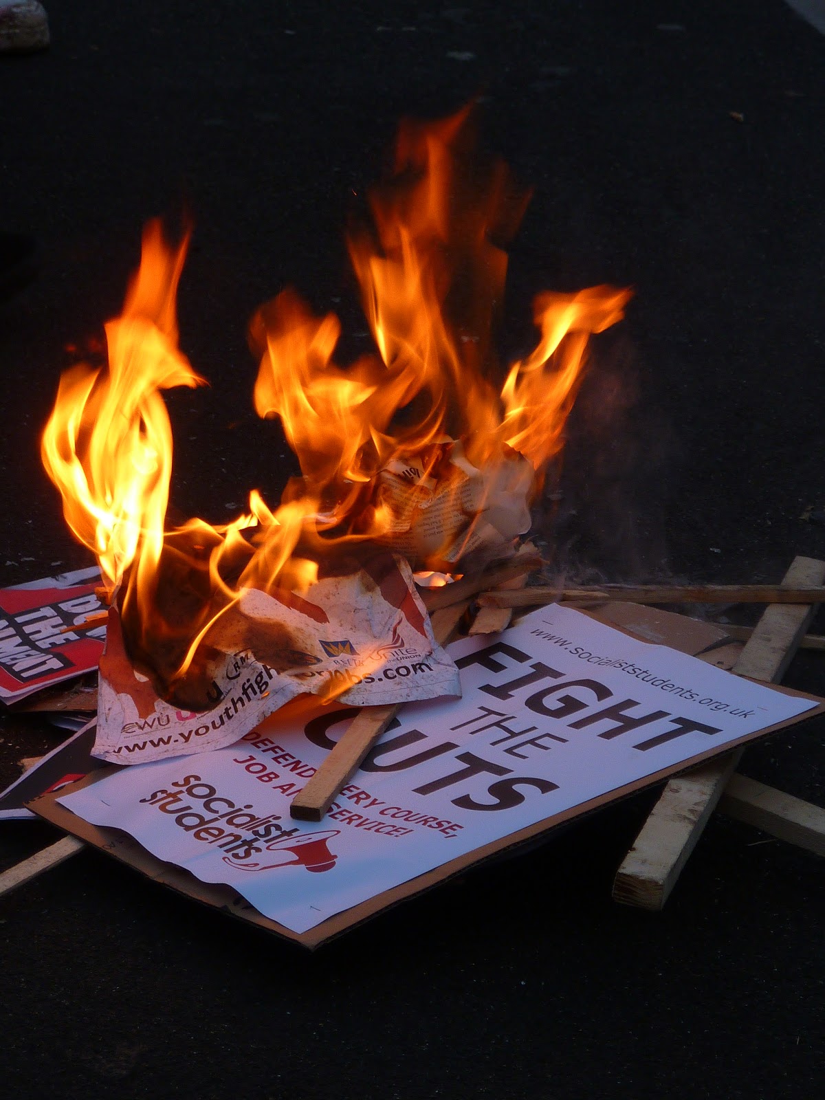 The atmosphere starts to turn sour as the afternoon wears on. My friend and I wander around Parliament Square at about three: barriers have been broken down and trampled on. Walls and statues are covered in graffiti, and in the centre of the square, someone has set fire to a pair of wooden benches. At one point, there is a sudden wave of panic and people start running in all directions. I find out later that there have been clashes with police officers on horseback.